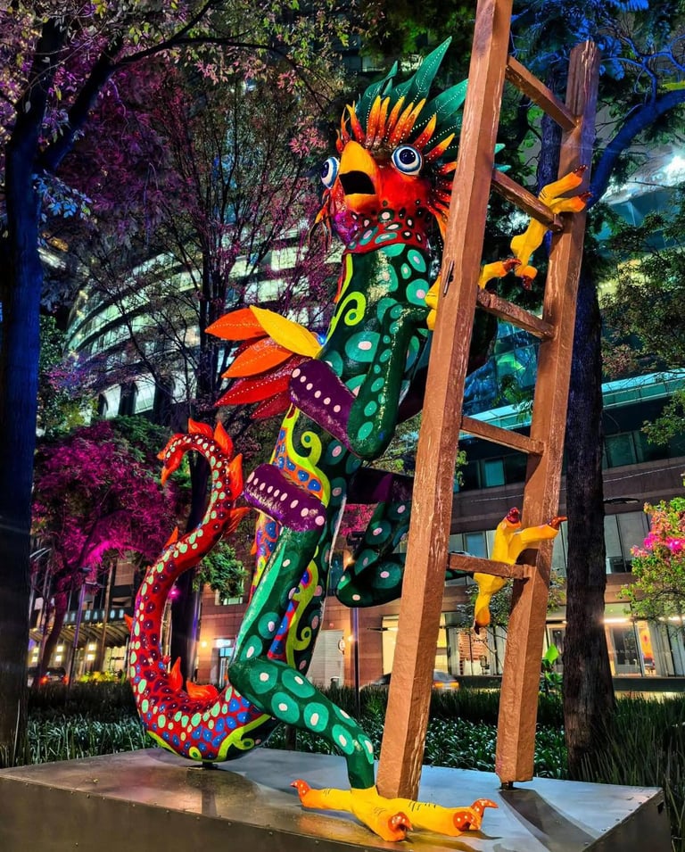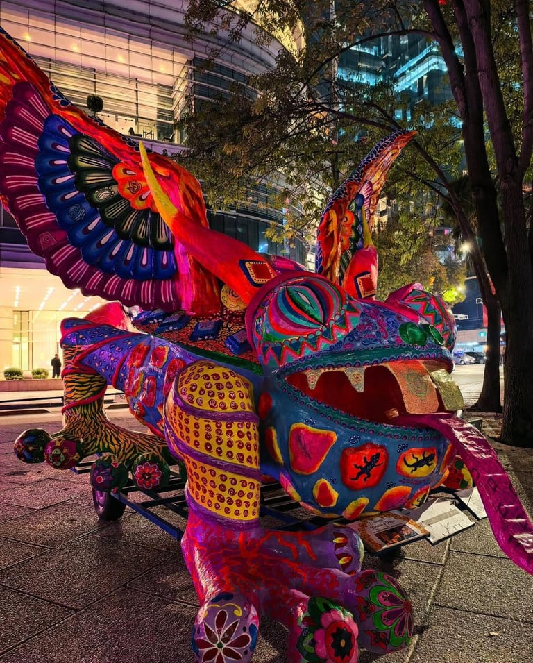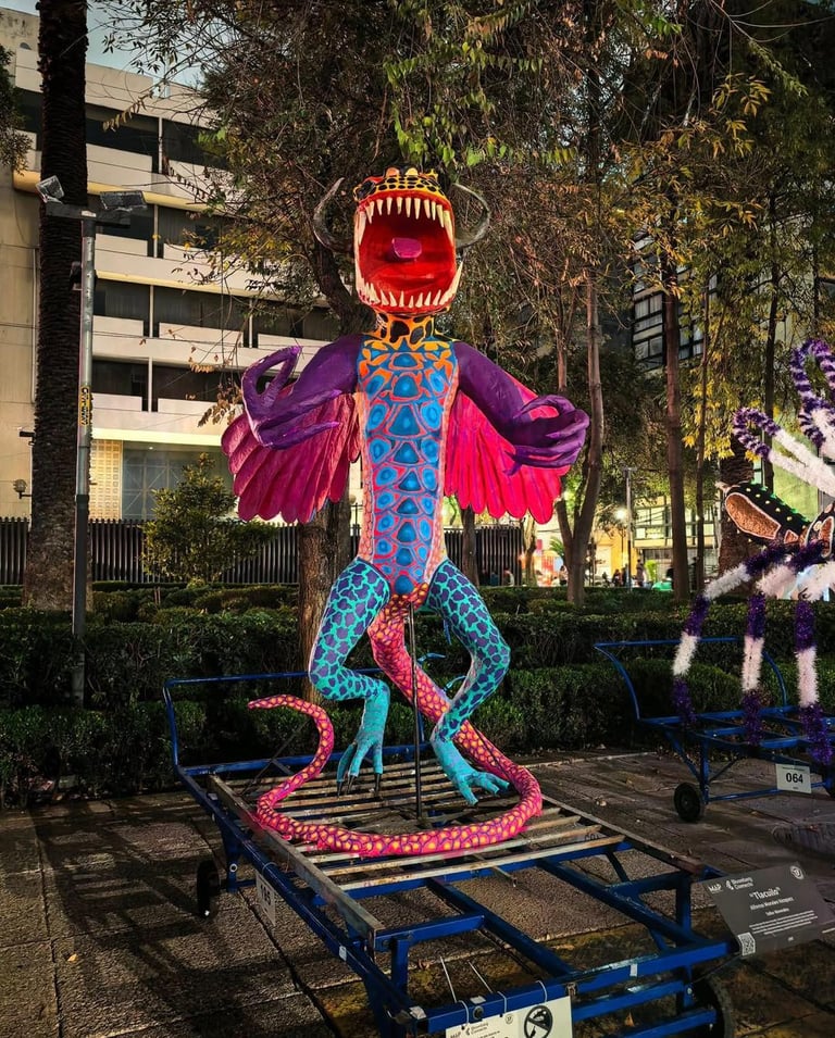 1930年代、職人ペドロ・リナーレスの夢から生まれた空想の生き物です。紙と糊で作るカルトネリアという張り子の技法で形を作り、手作業で鮮やかに彩色します。実在と空想の動物を組み合わせた独特の姿は、メキシコの創造性の象徴。毎年秋には全国の工房とアーティストが巨大作品を制作し、レフォルマ通りで展示・パレードがおこなわれ、死者の日の記憶とつながりを祝います。